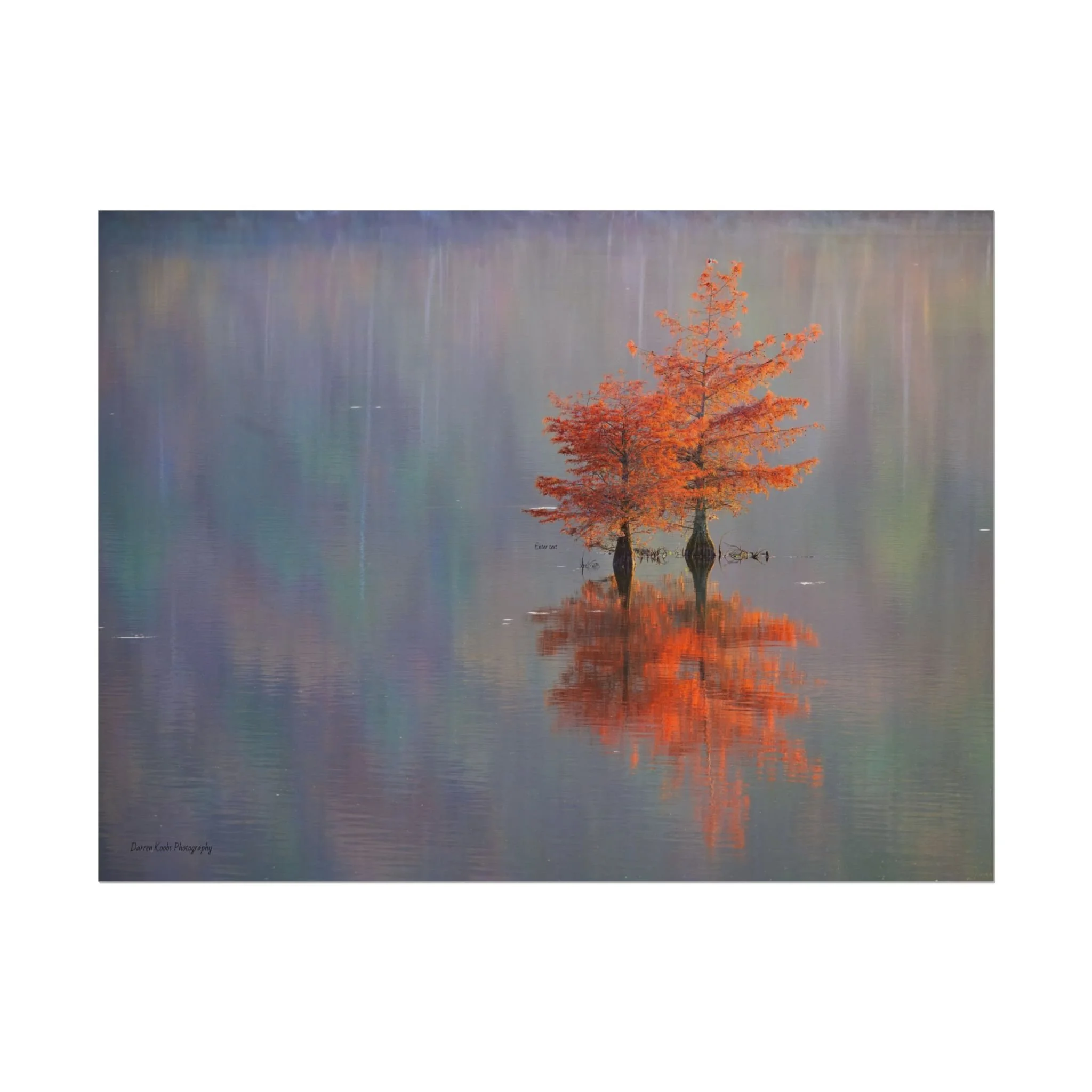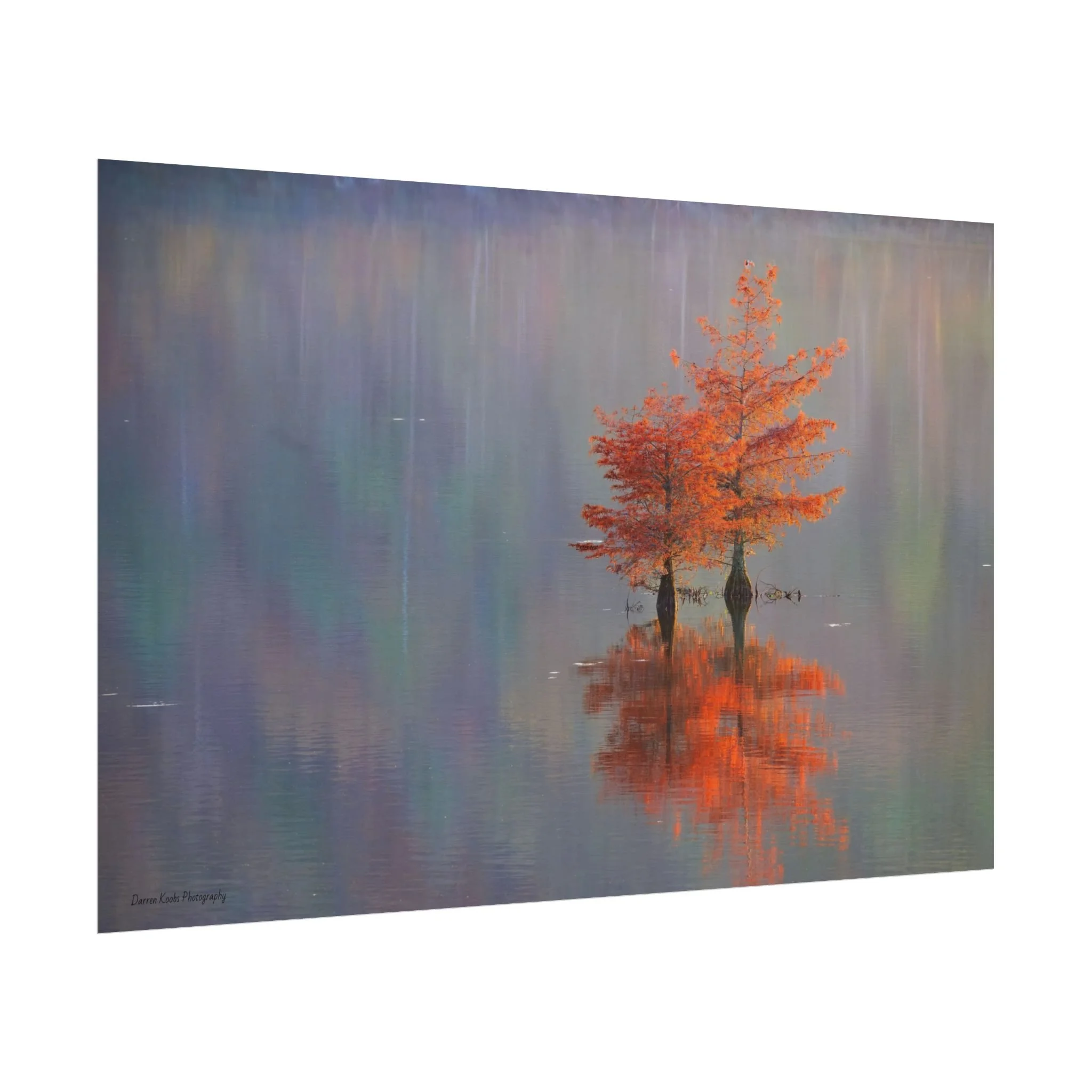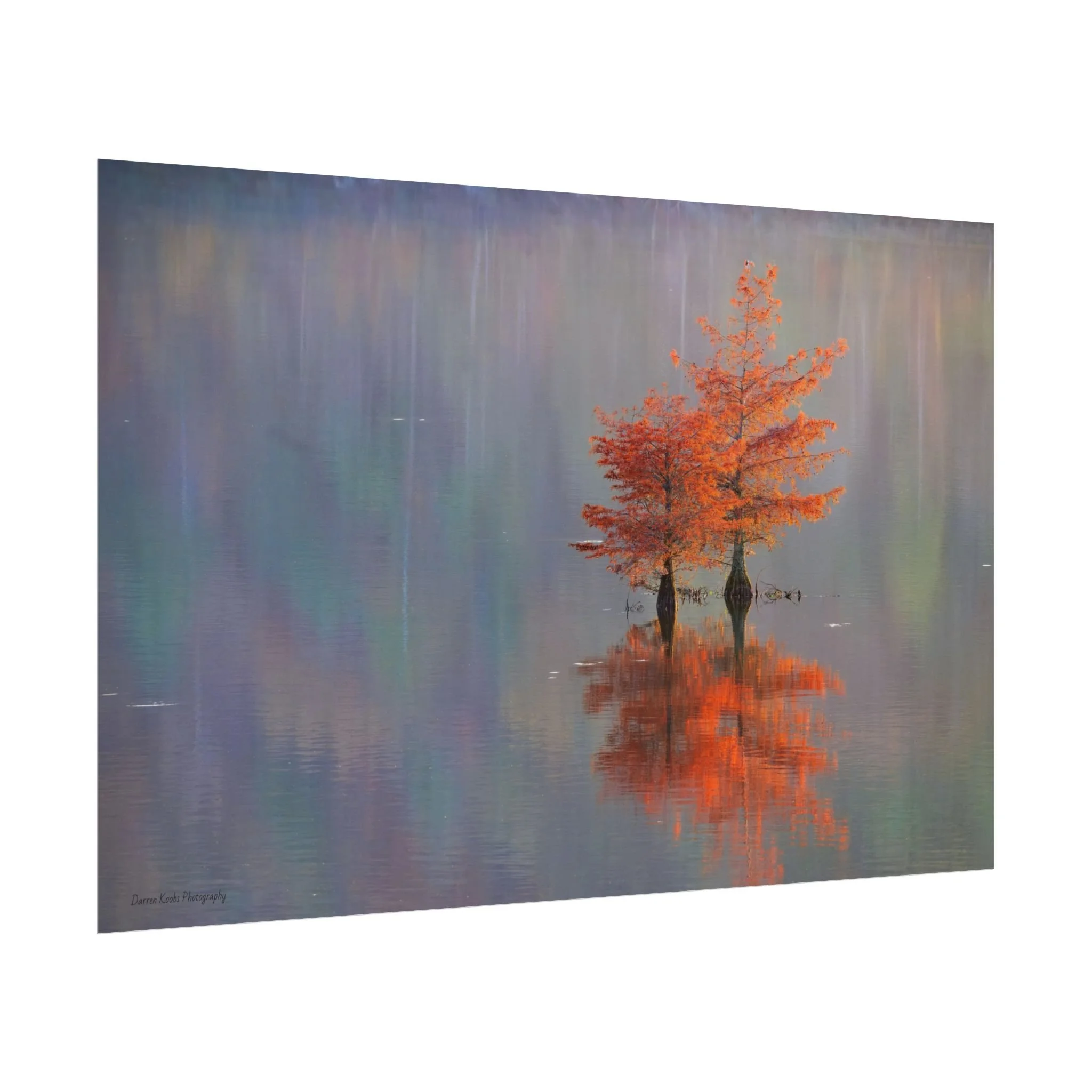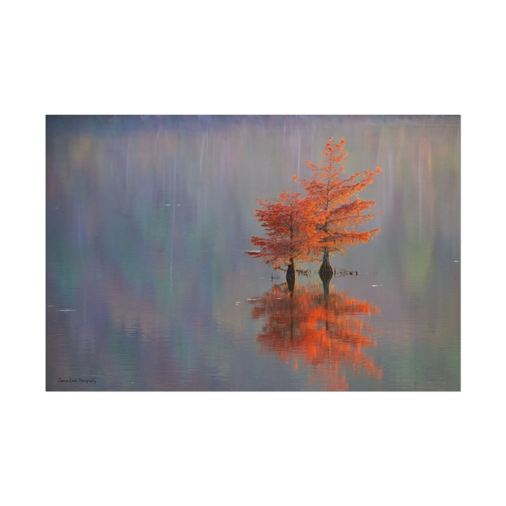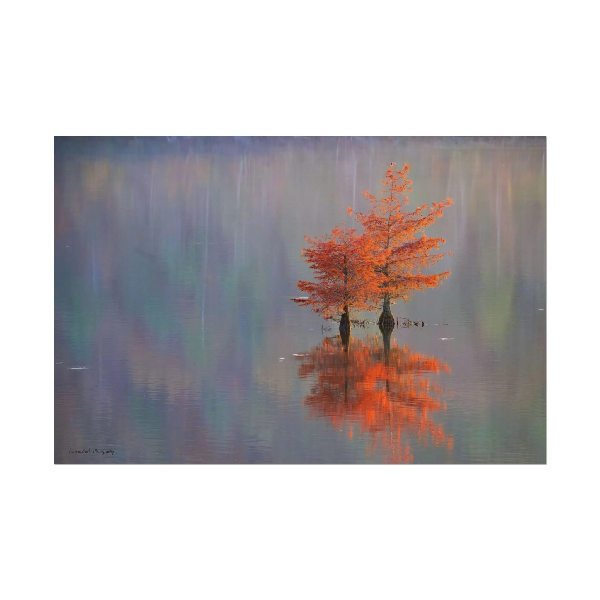 A serene view of cyprus trees in full autumn color reflected in still water. Soft, painterly color wash the background in muted blues, greens, and yellows, while the tree’s fiery orange becomes the focal point—warm, reflective, and quietly dramatic. Choose from two paper types to suit your space: semi-glossy photo paper for vivid color and sharp detail, or matte for a softer, artful finish. Available in five