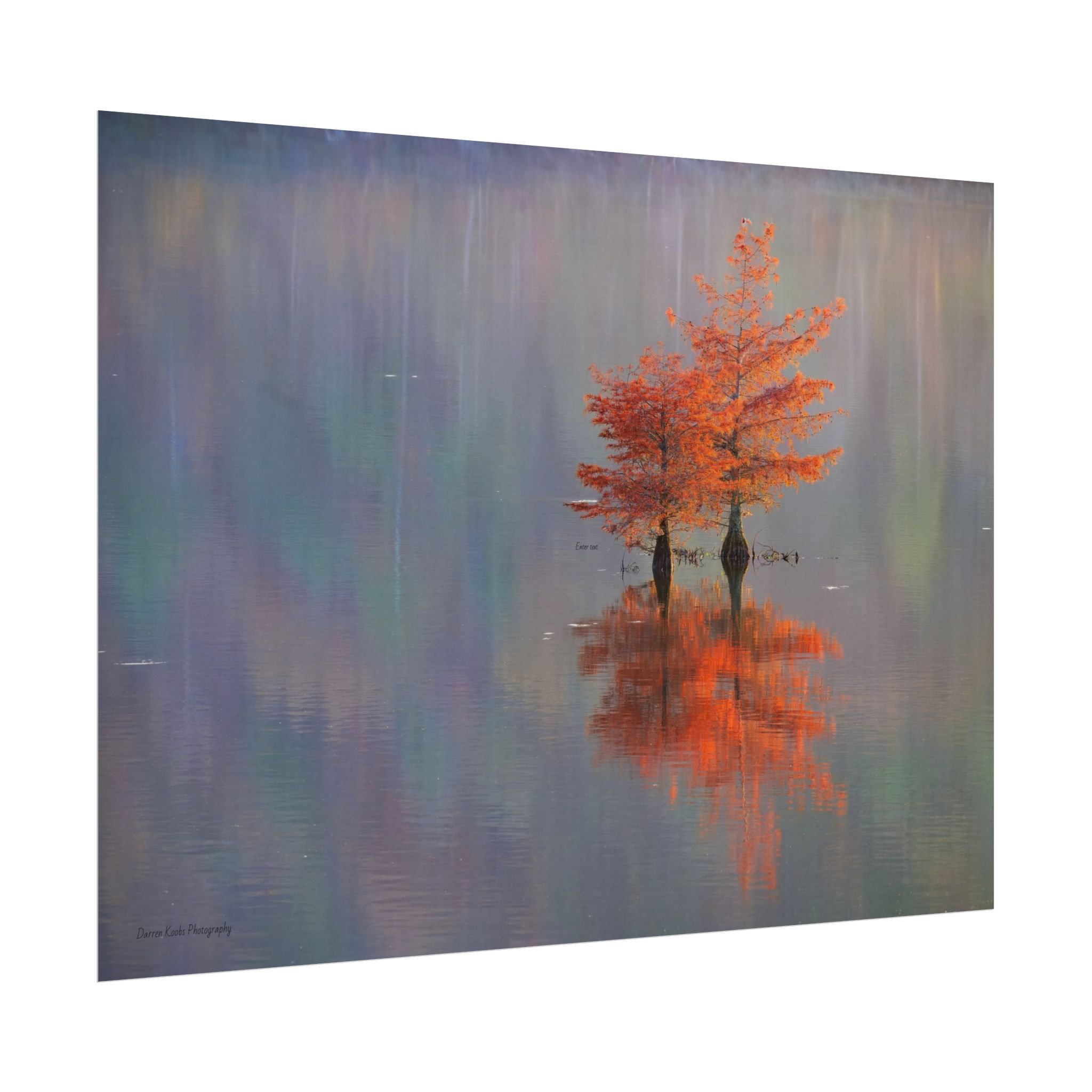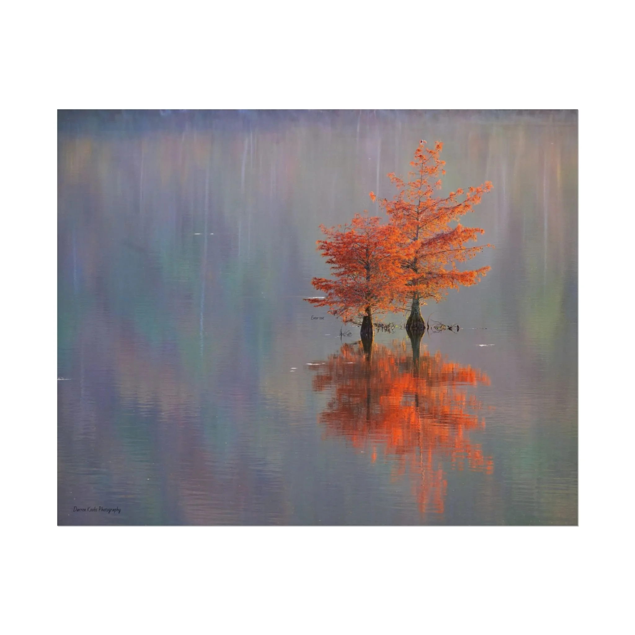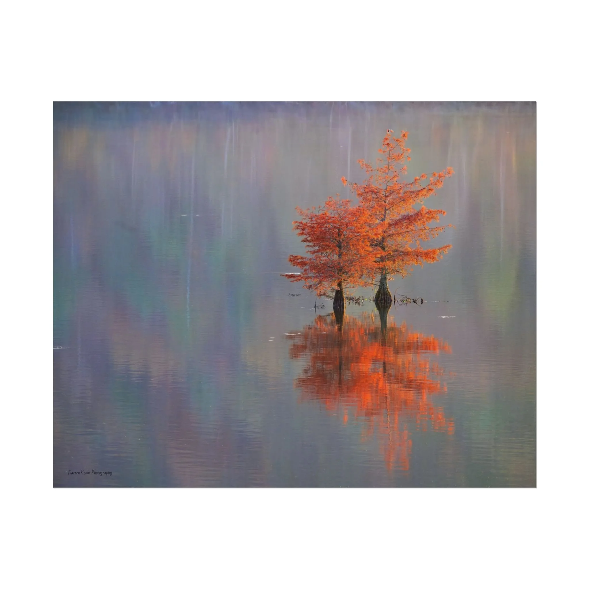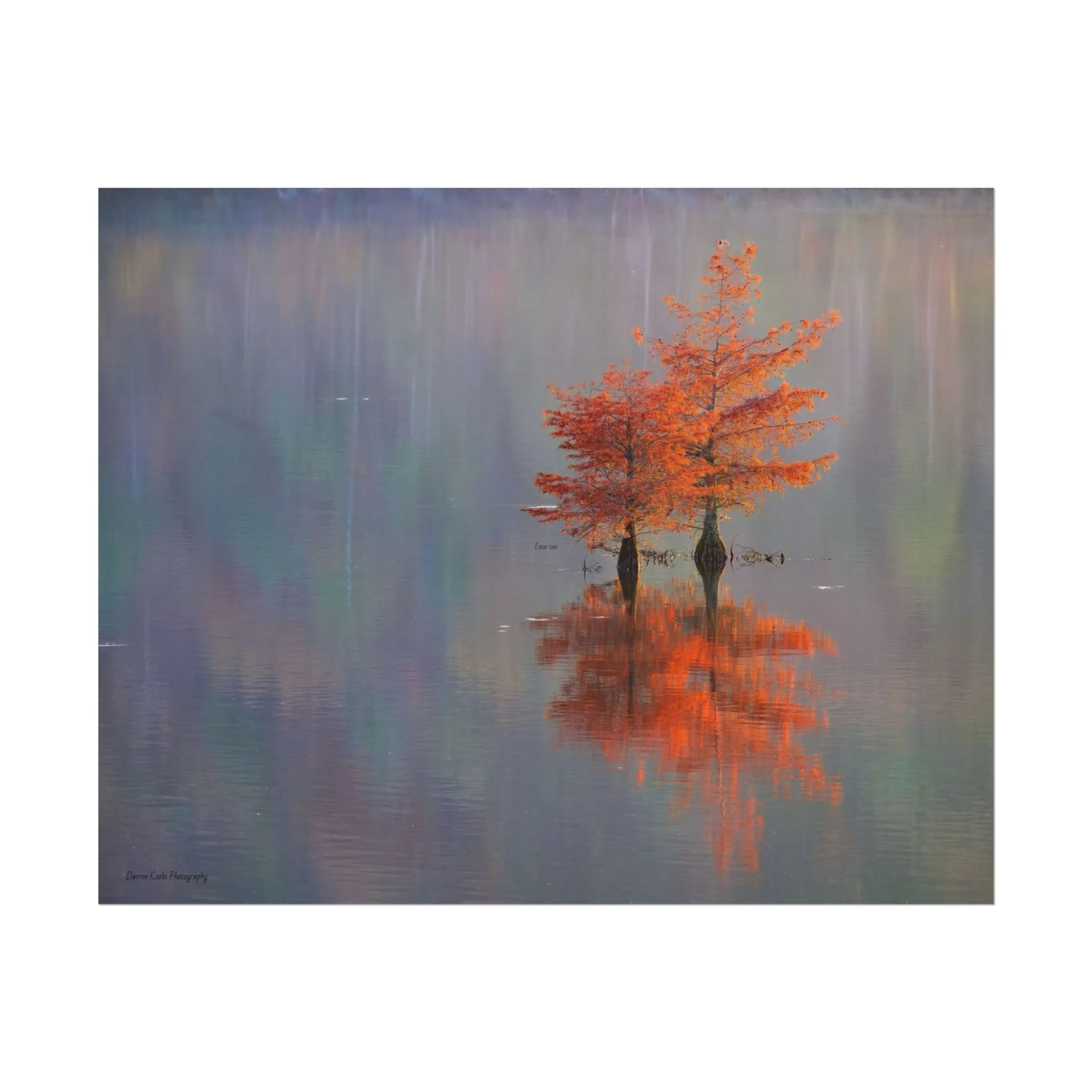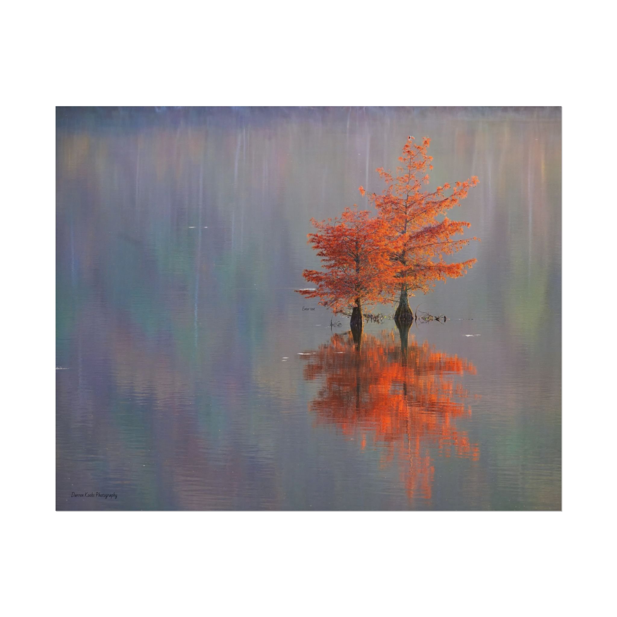 A serene view of cyprus trees in full autumn color reflected in still water. Soft, painterly color wash the background in muted blues, greens, and yellows, while the tree’s fiery orange becomes the focal point—warm, reflective, and quietly dramatic. Choose from two paper types to suit your space: semi-glossy photo paper for vivid color and sharp detail, or matte for a softer, artful finish. Available in five