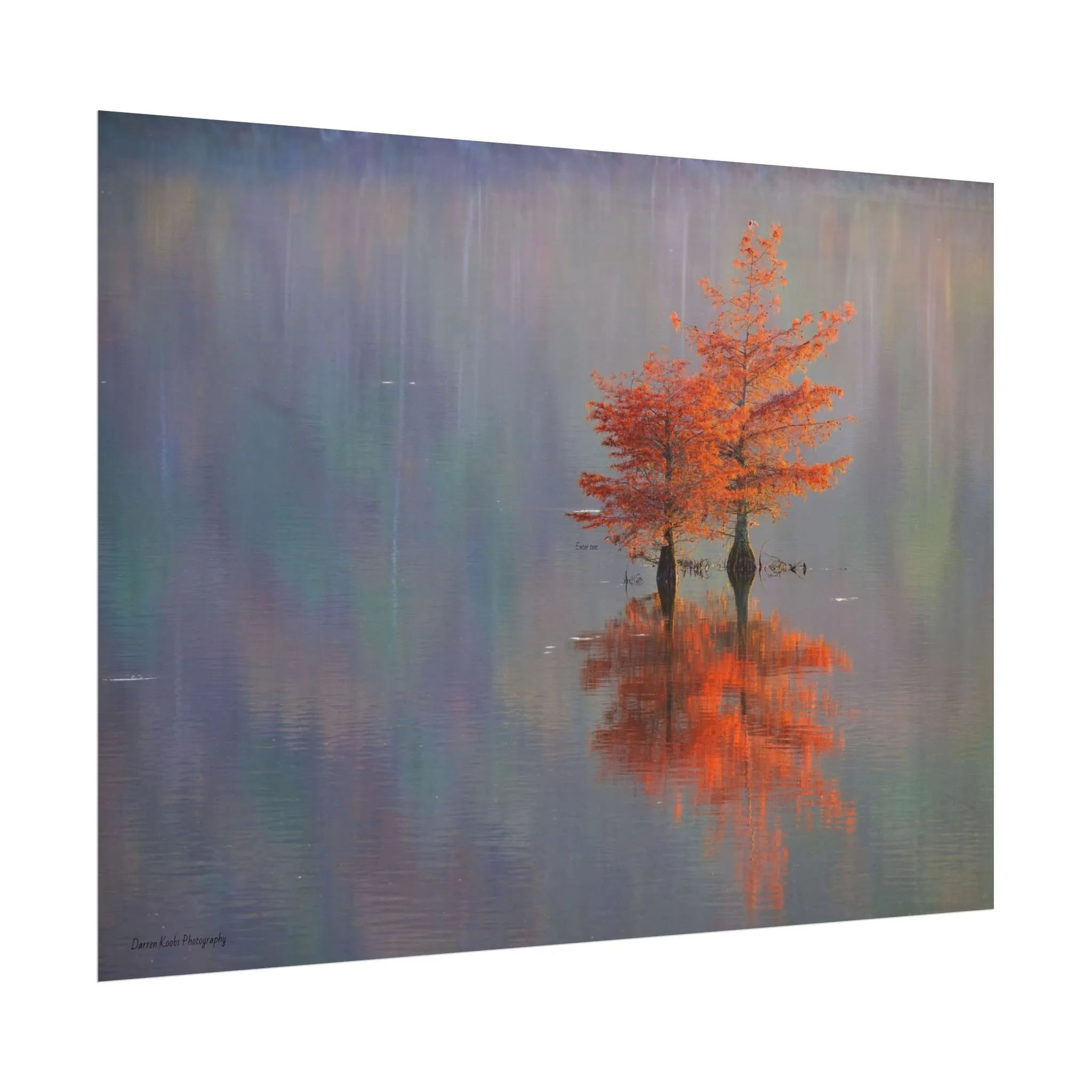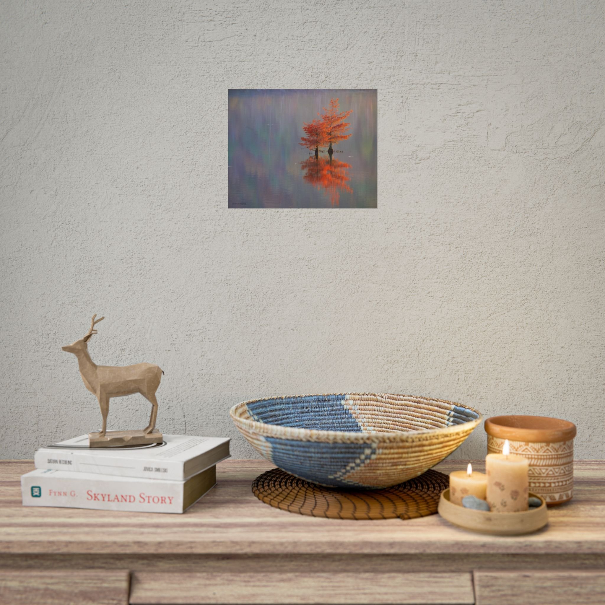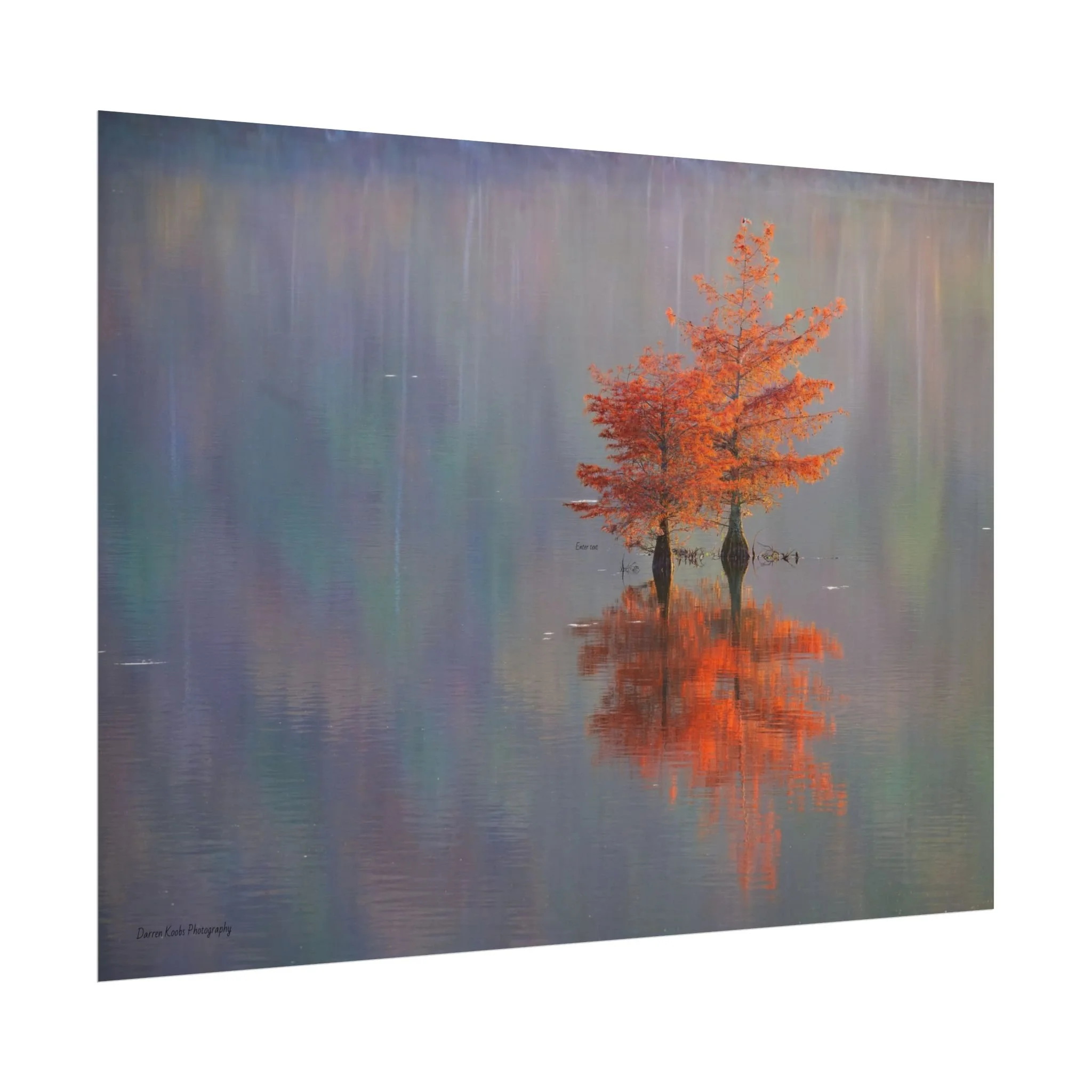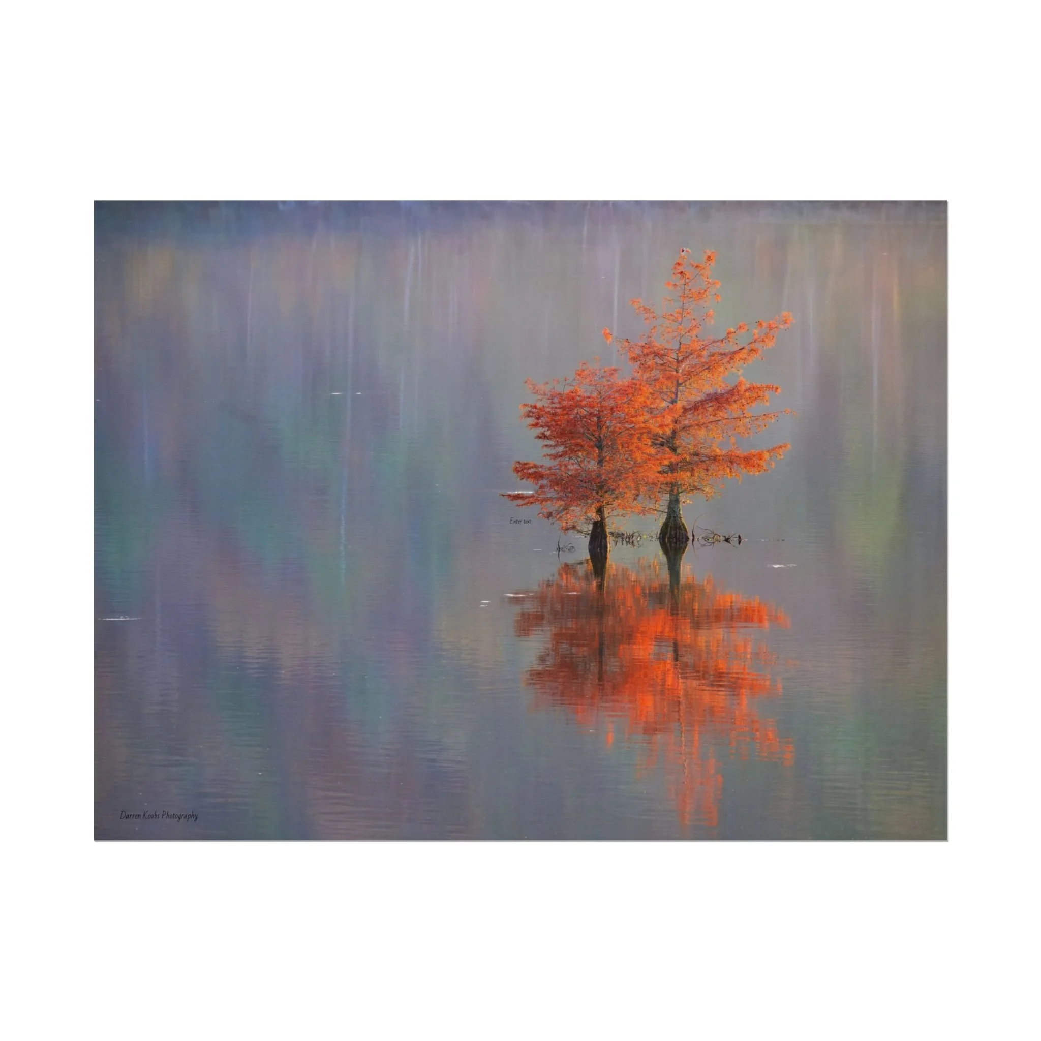 A serene view of cyprus trees in full autumn color reflected in still water. Soft, painterly color wash the background in muted blues, greens, and yellows, while the tree’s fiery orange becomes the focal point—warm, reflective, and quietly dramatic. Choose from two paper types to suit your space: semi-glossy photo paper for vivid color and sharp detail, or matte for a softer, artful finish. Available in five