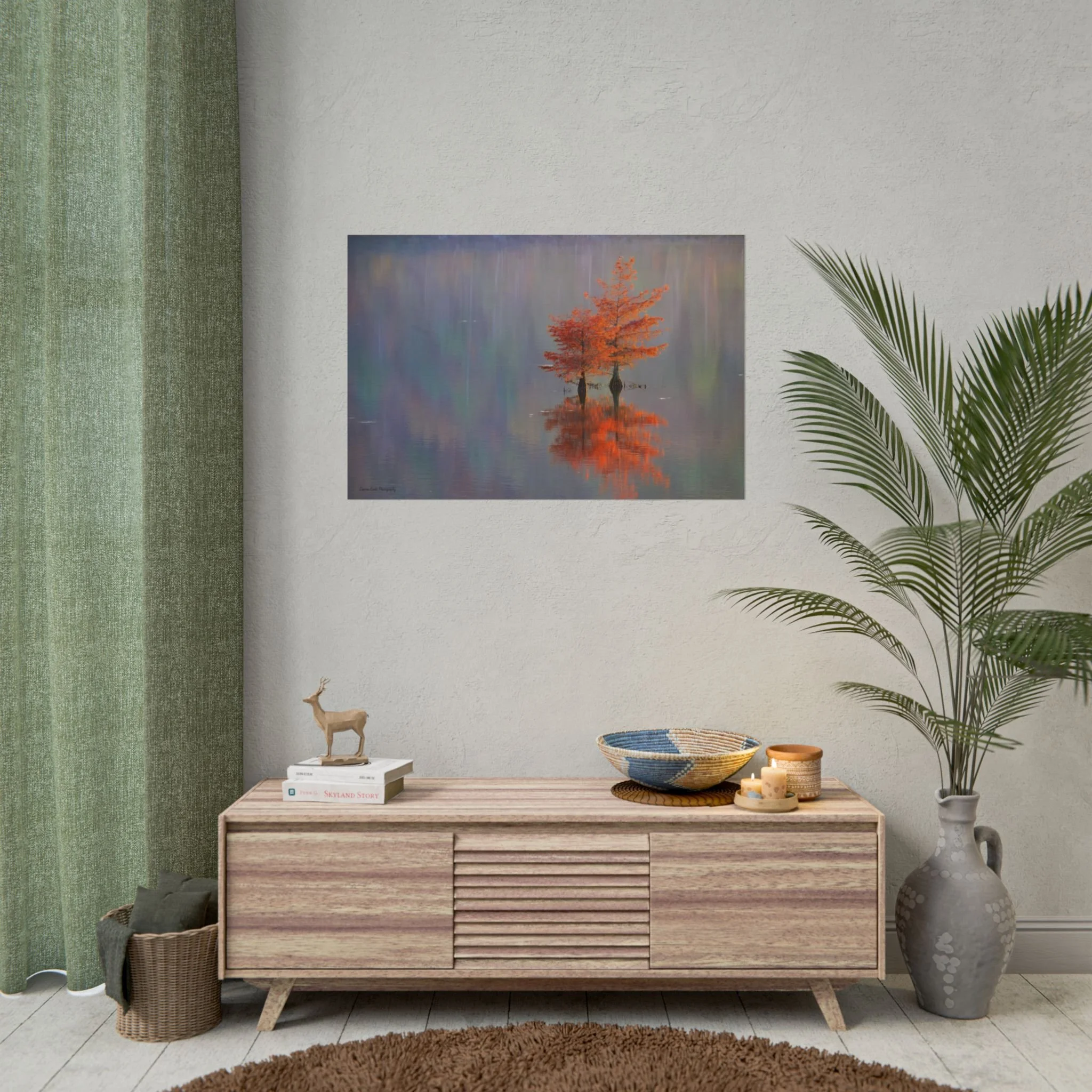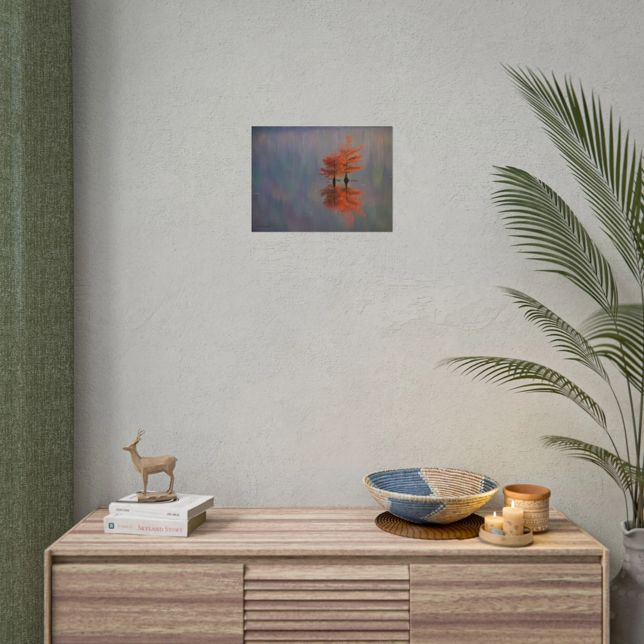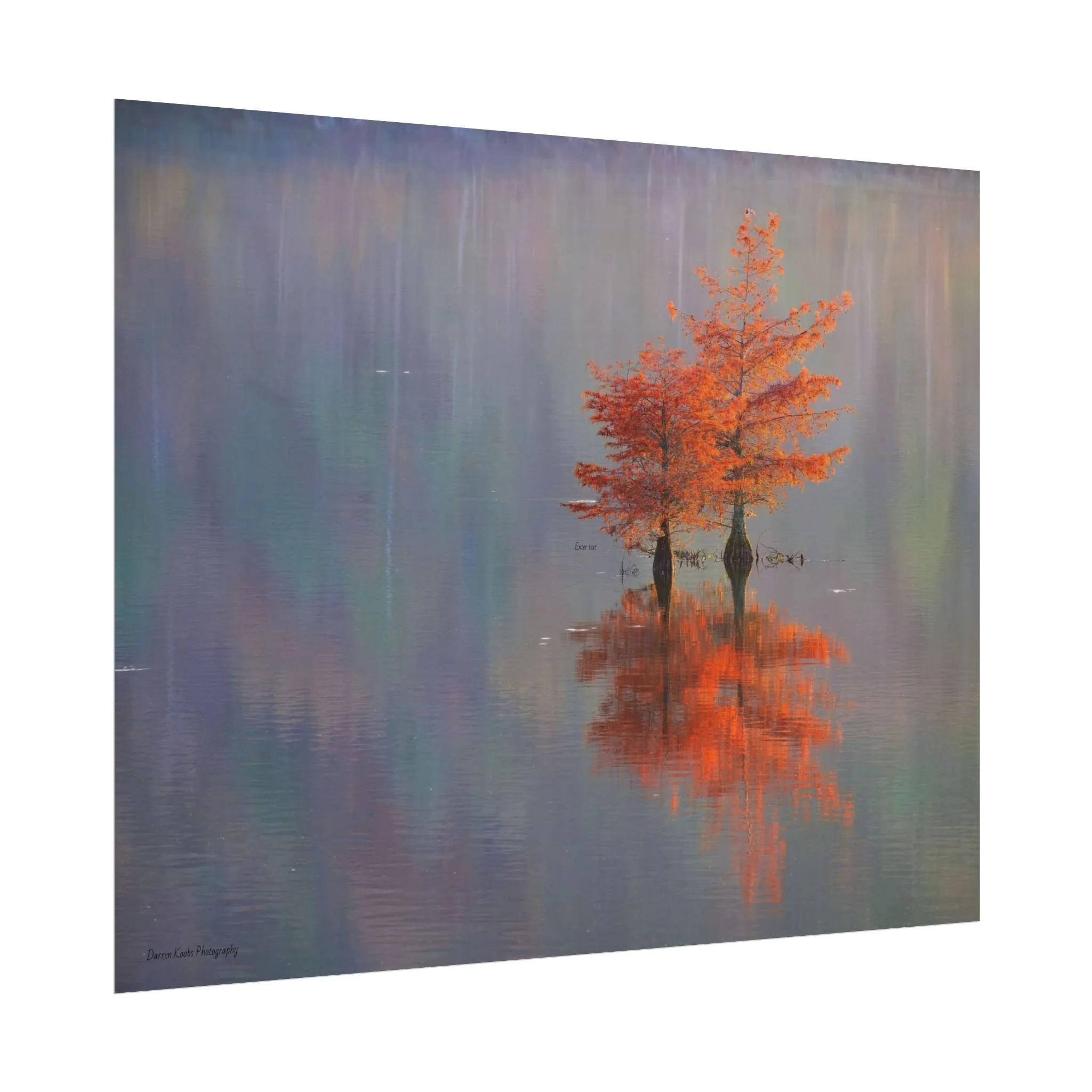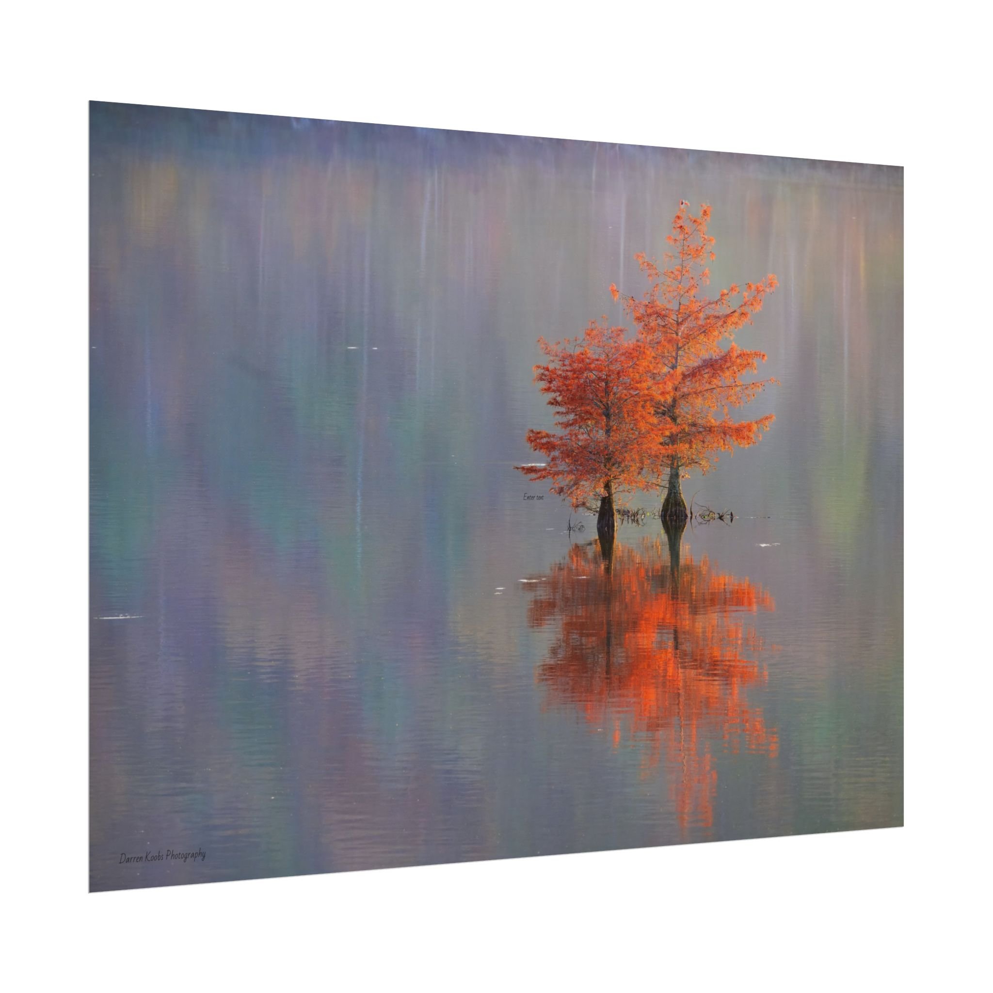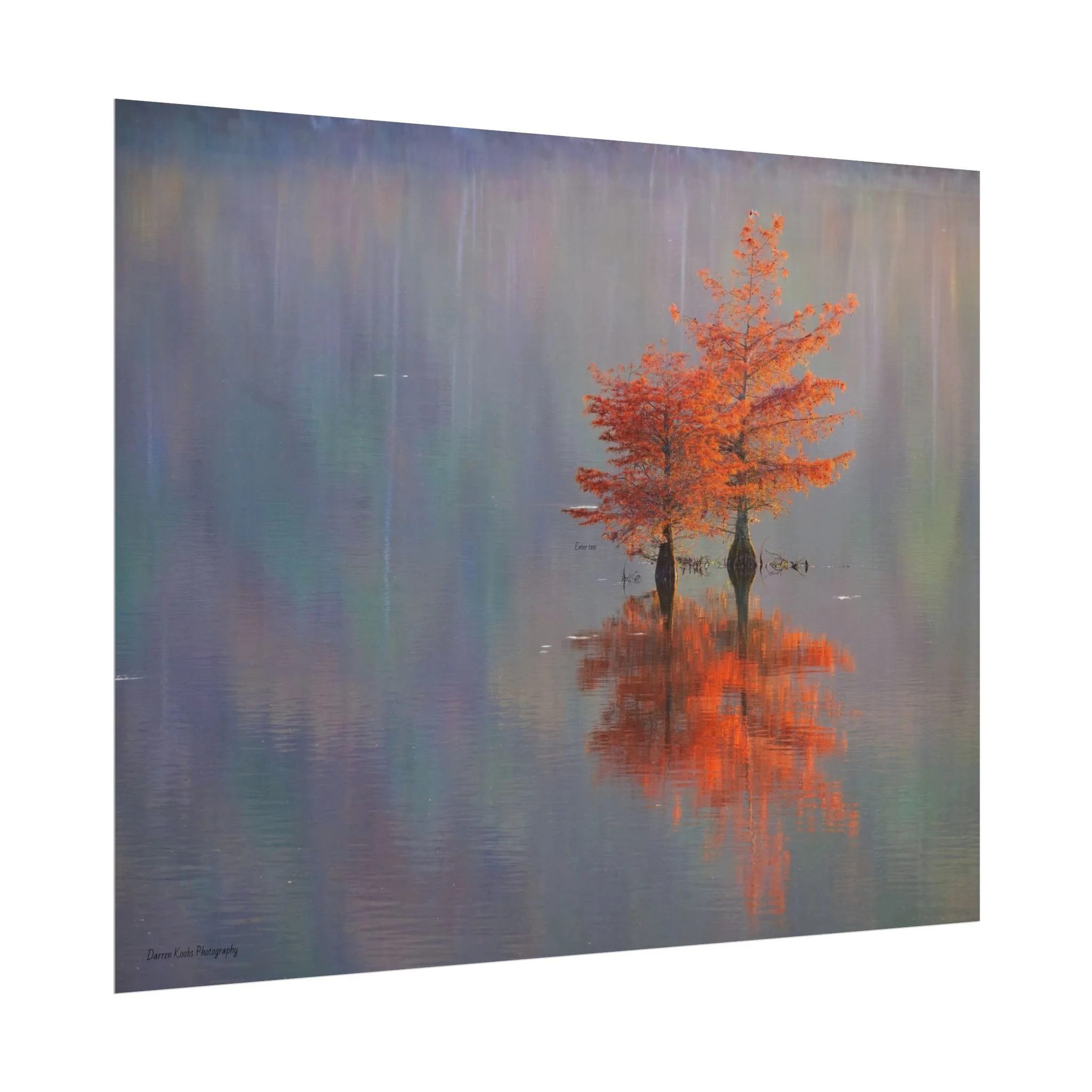 A serene view of cyprus trees in full autumn color reflected in still water. Soft, painterly color wash the background in muted blues, greens, and yellows, while the tree’s fiery orange becomes the focal point—warm, reflective, and quietly dramatic. Choose from two paper types to suit your space: semi-glossy photo paper for vivid color and sharp detail, or matte for a softer, artful finish. Available in five