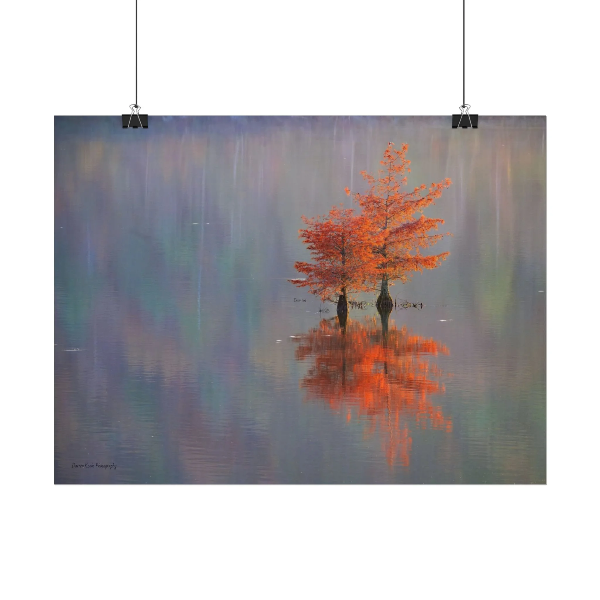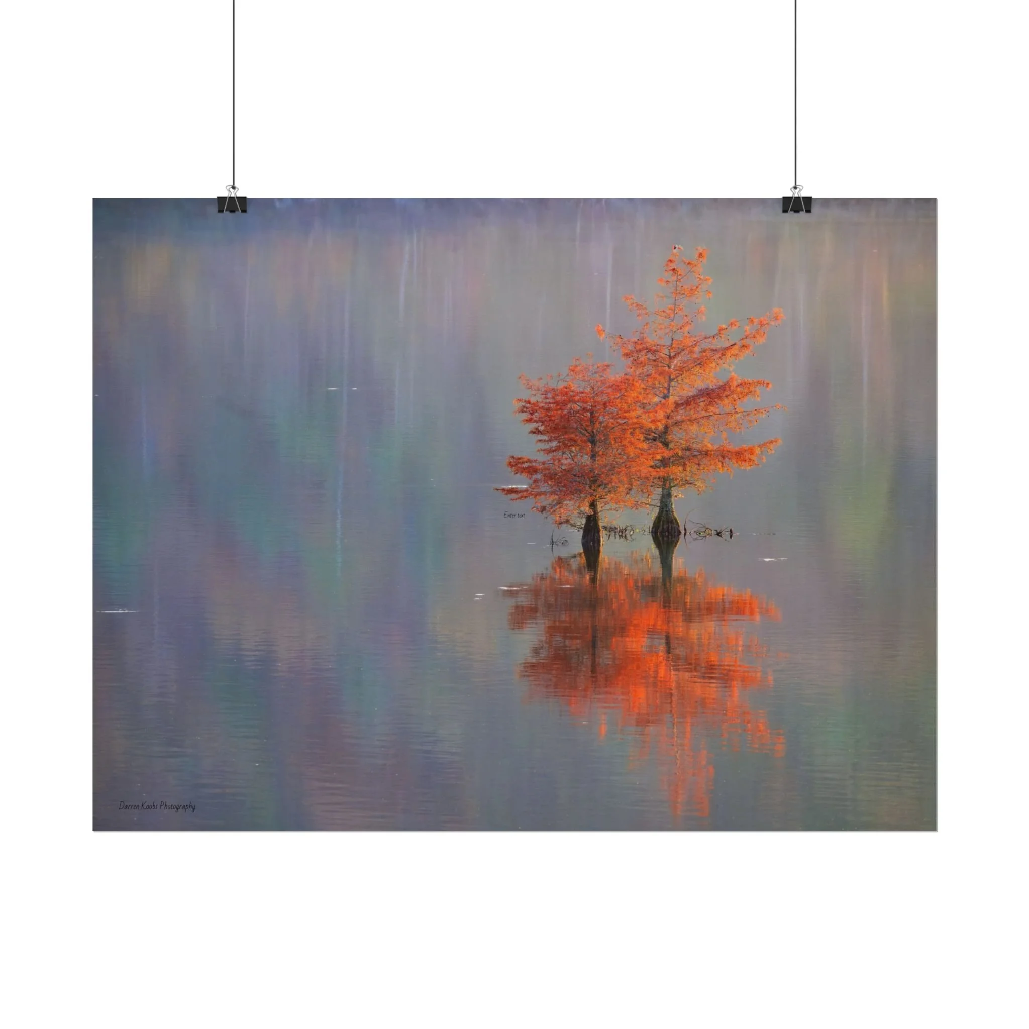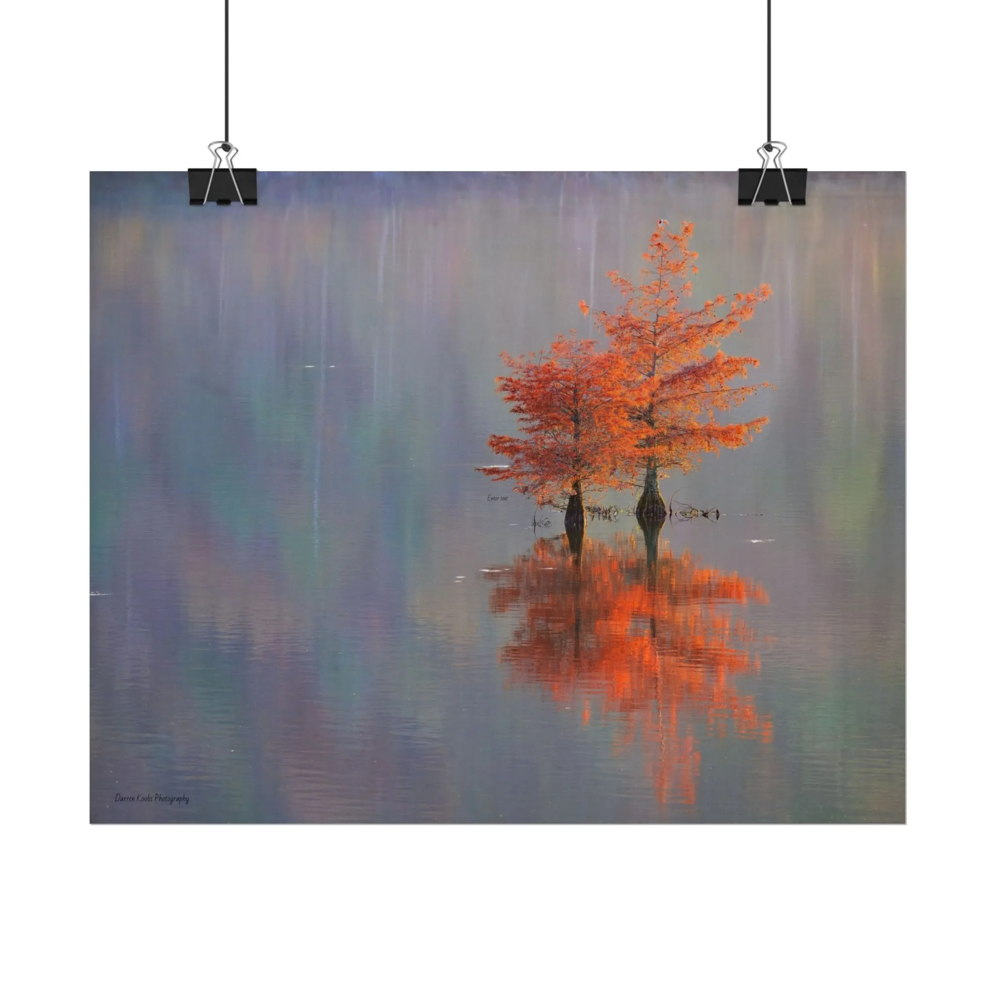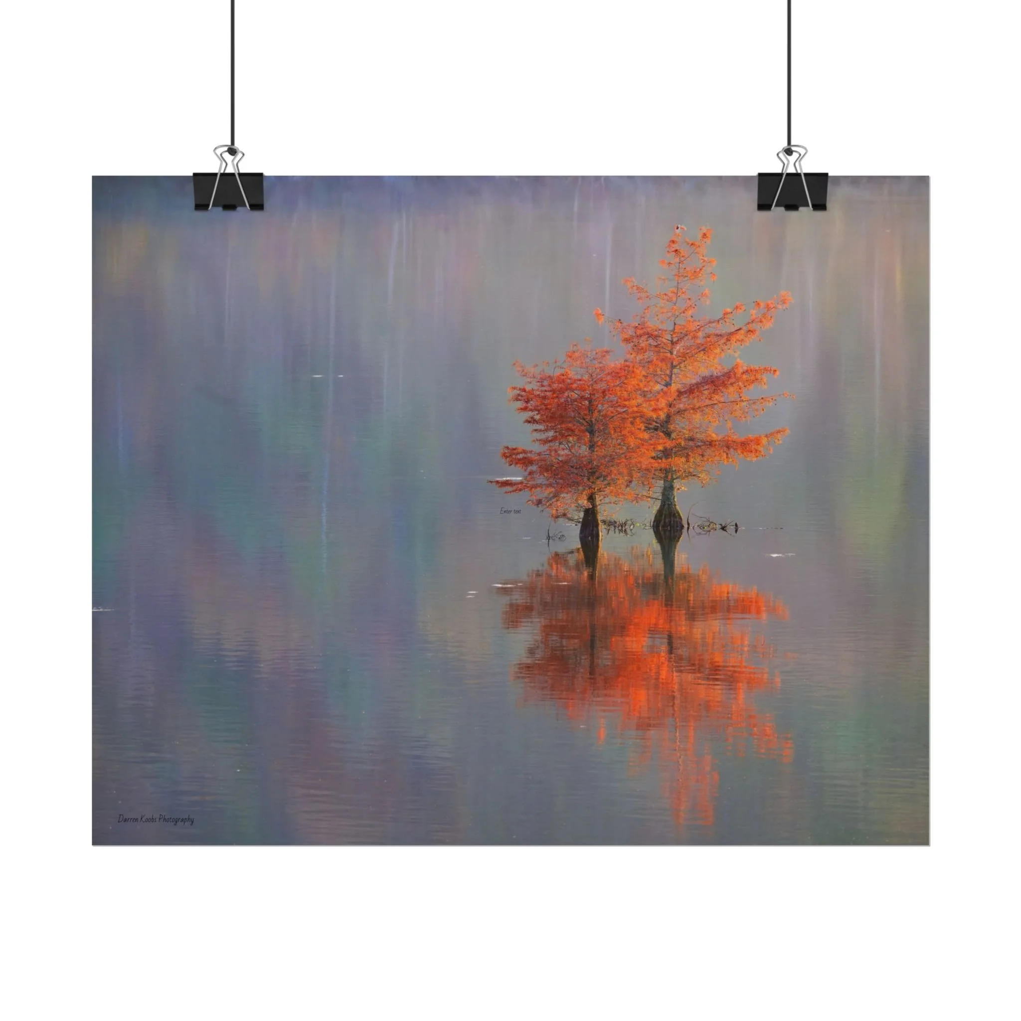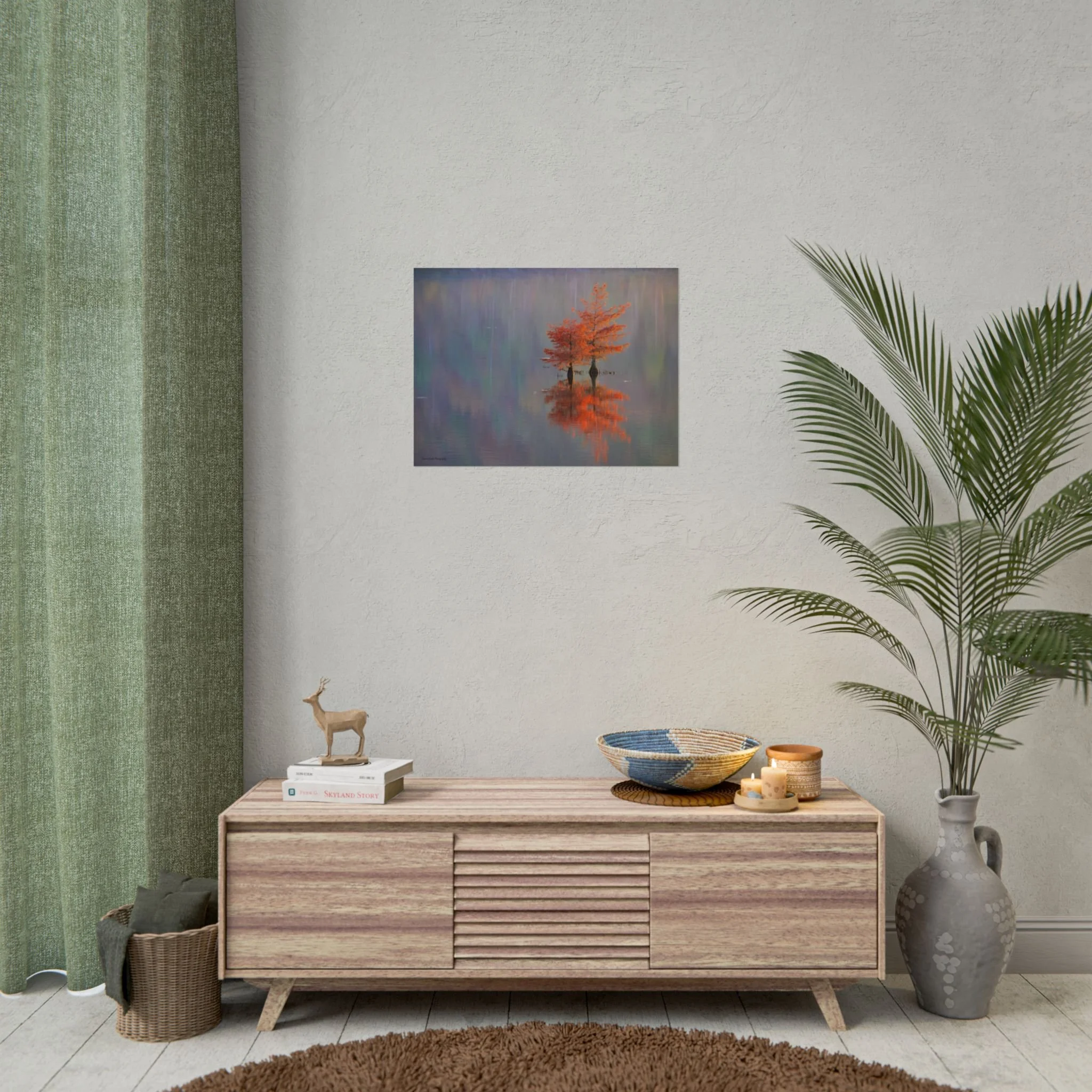 A serene view of cyprus trees in full autumn color reflected in still water. Soft, painterly color wash the background in muted blues, greens, and yellows, while the tree’s fiery orange becomes the focal point—warm, reflective, and quietly dramatic. Choose from two paper types to suit your space: semi-glossy photo paper for vivid color and sharp detail, or matte for a softer, artful finish. Available in five